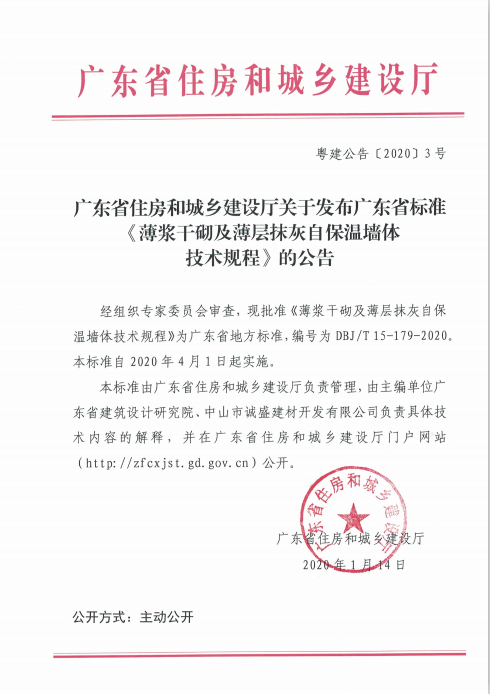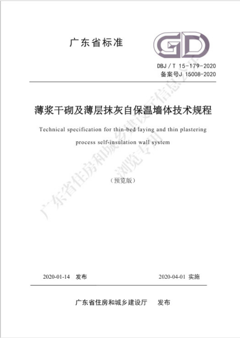 2020年1月广东省住房和城乡建设厅以粤建公告[2020]3号的形式发布了广东省标准《薄浆干砌及薄层抹灰自保温墙体技术规程》实施的公告,本标准由我司与广东省建筑设计研究院联合主编,将于2020年4月1日正式实施。