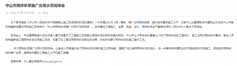为了贯彻落实《中山市人民政府关于限期禁止施工现场搅拌砂浆的通告》(中府通[2015] 1号)精神,推广应用预拌砂浆,提升我市建筑施工水平,日前中山住建局联合市建...